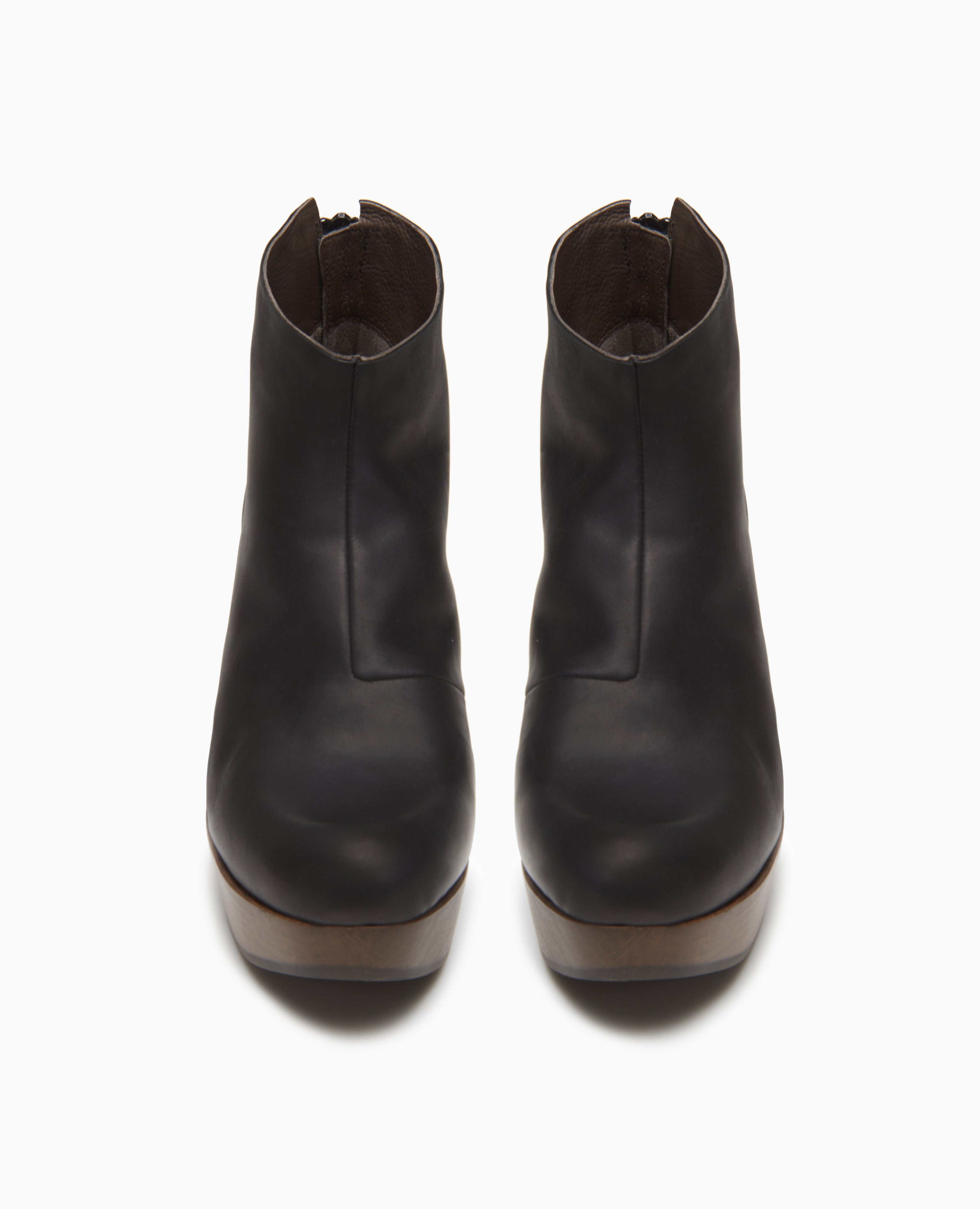Our classic clog?bootie with a flattering asymmetrical tilt, in rich black leather. Back zip closure.